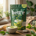Mixul BIO pentru matcha latte Bett'r combina pudra de matcha de calitate inalta, de grad ceremonial, cu bautura din ovaz si bautura din orez, toate sub forma de pulbere.